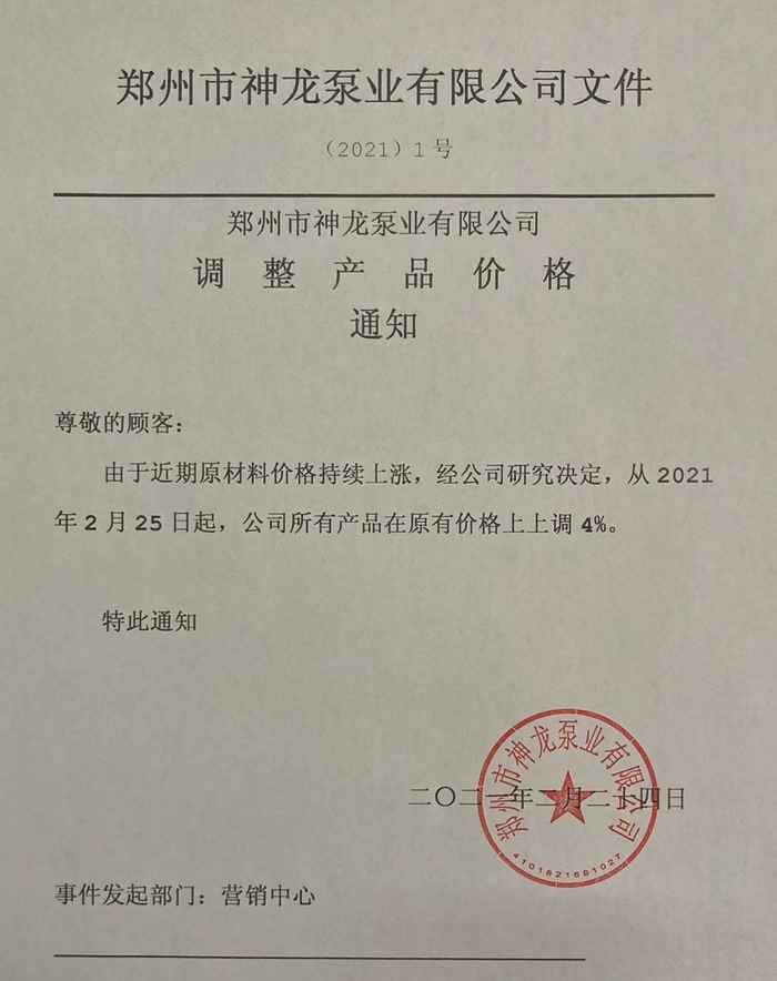 本公司所有产品于2021年3月1日起在12月15日调价的基础上销售价格再次上调4%
